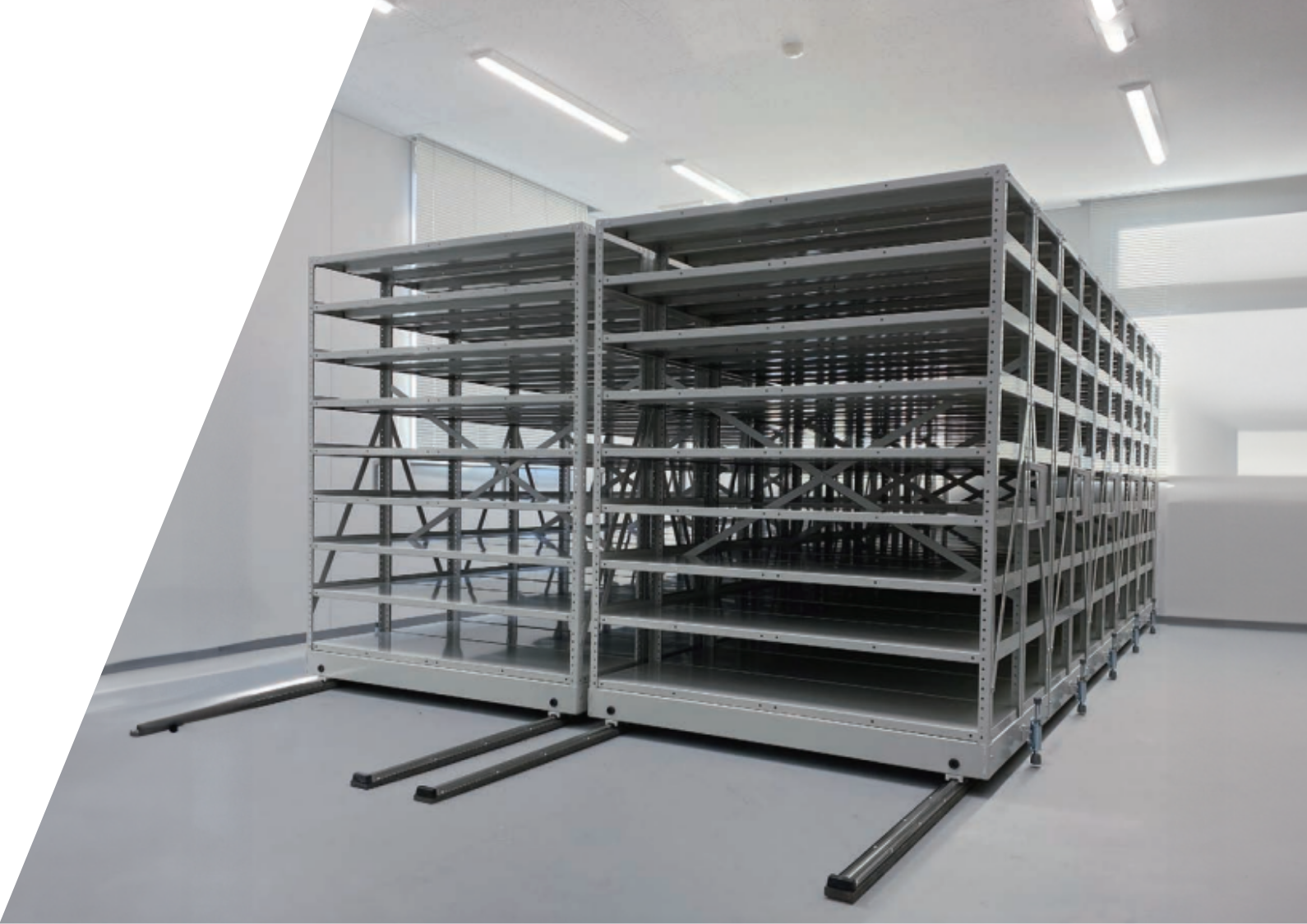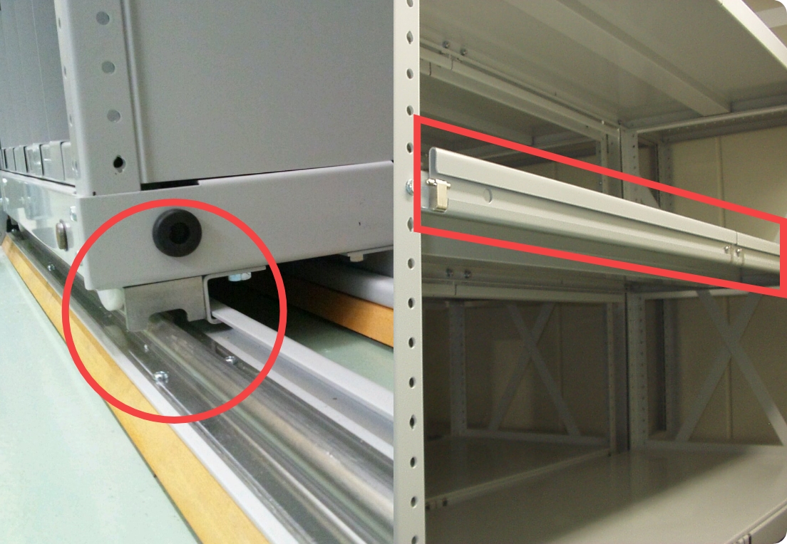 大規模な施工は必要ありません。いま使用している固定棚も、レールシステムの上に配置すれば移動棚に早変わり。新築・改造・再配置を問わず、最も効率的かつ低コストな施工で震災対策を実現します。